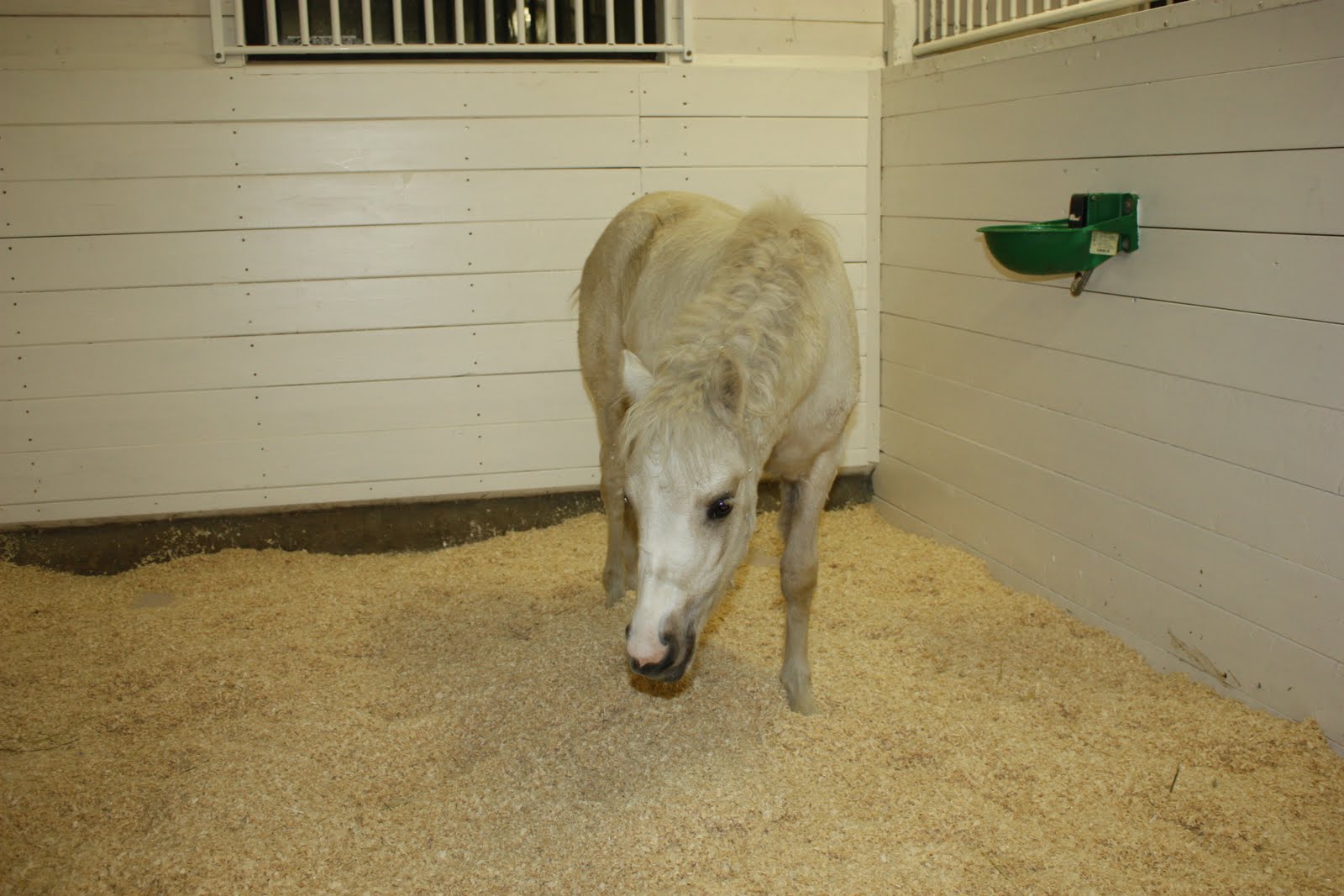 Roligt med spån att springa i men om man satsar lite för mycket så sprattlar benen uppåt istället om man inte passar sig. En stor sur rackare verkar bo på andra sidan väggen. Hoppas hon är på bättre humör imorgon bitti då hon ska visa mig runt i stora hagarna! :-)