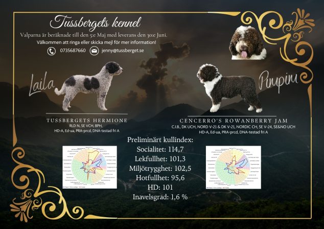Aktuella kullar Tussbergets Bodil ”Lexi” och Aberlours Stuck on You ”Milo” Valpar planeras till 27:e april! Läs mer om kullen här Cencerro’s Rowanberry Jam ”Pimpim” och Tussbergets Hermione ”Laila” Valpar planeras till 5:e maj! Läs mer om kullen här
