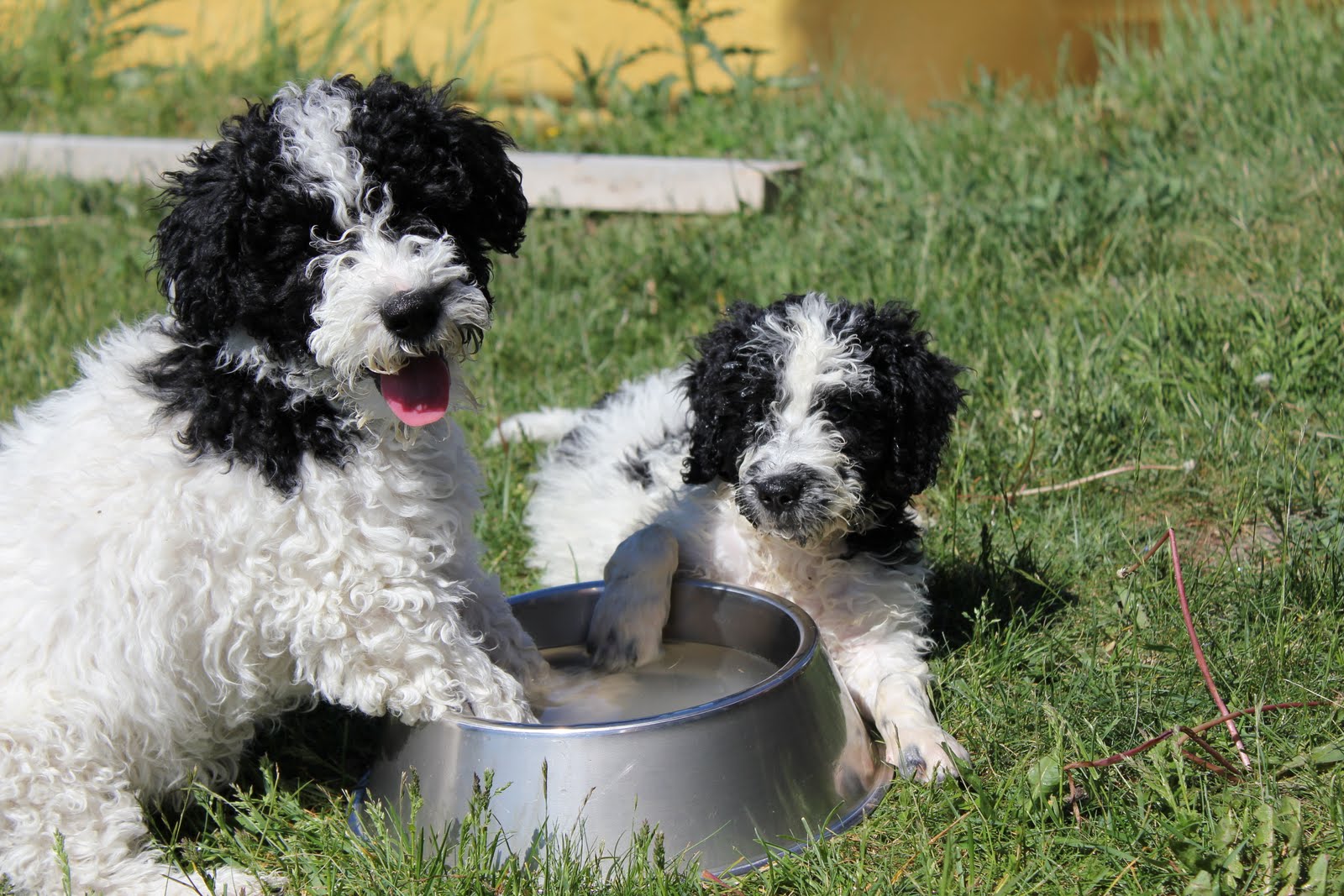 Cava och Jippi lekte på gräsmattan och det är bara så mysigt att doppa tassarna i vattenskålen! Dessa två valpar är lika som bär men just nu så är Cava lite större bara… ;-)