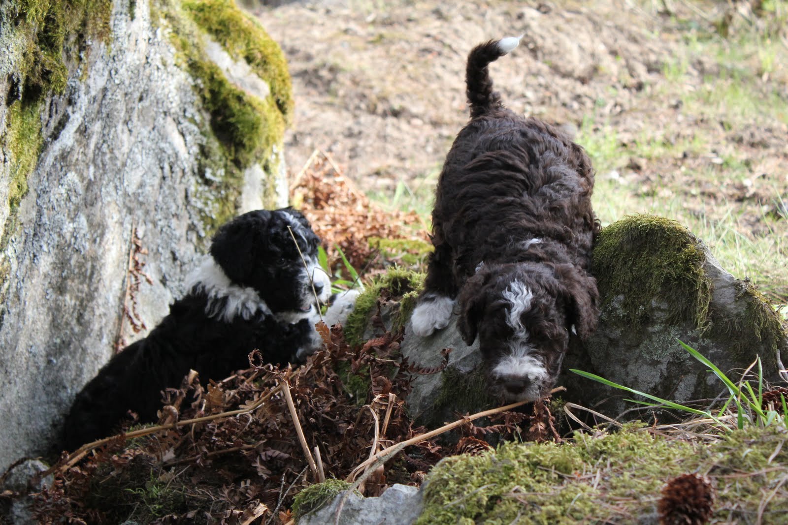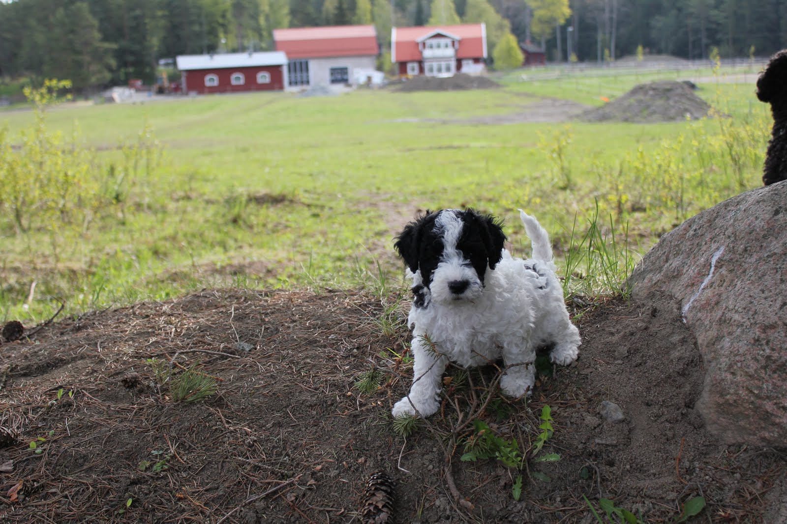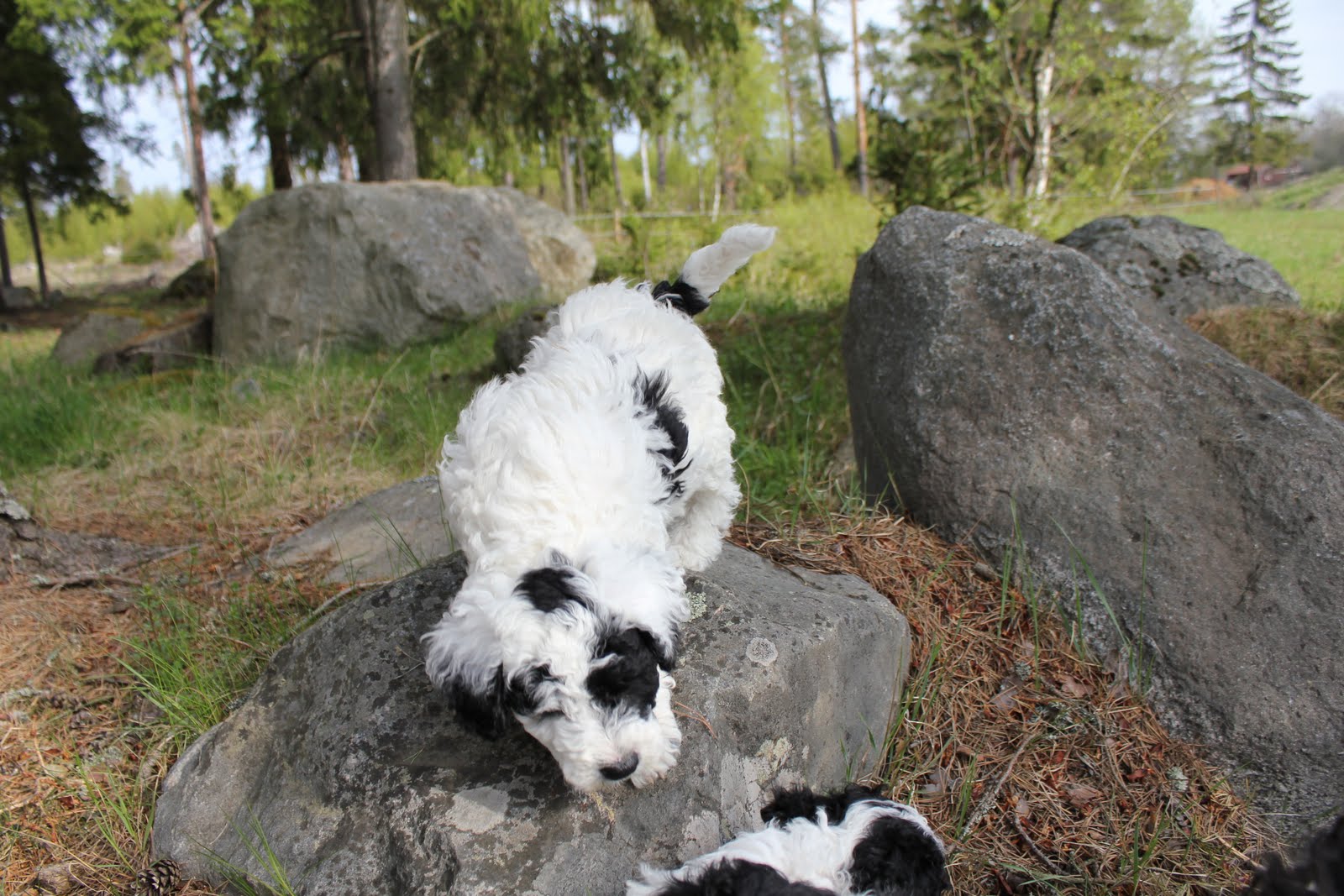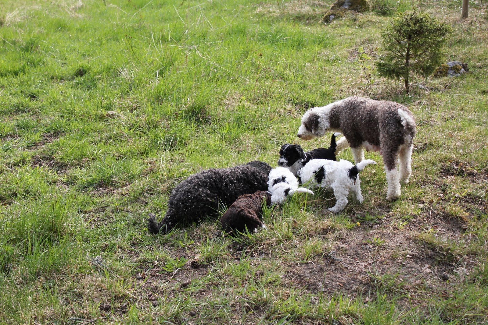 Idag blir Ellas valpar 7 veckor och Bombis blir 5 veckor. Härligt väder och grönt gräs att springa i. Bombi och Ella hjälps åt att hålla reda på de 4 ”stora” valparna när det är dax för promenad. Ikväll blir alla fotograferade igen så snart finns det flera bilder att titta på.