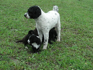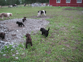 Blogg Full fart i hagen! 26 augusti, 2010 / Dom små valparna börjar att bli stora nu och kan följa med på promenad i hästhagen. Här syns alla sex valparna om man tittar noga. ;-) Men en matpaus fick det bli efter allt nytt att titta och lukta på.