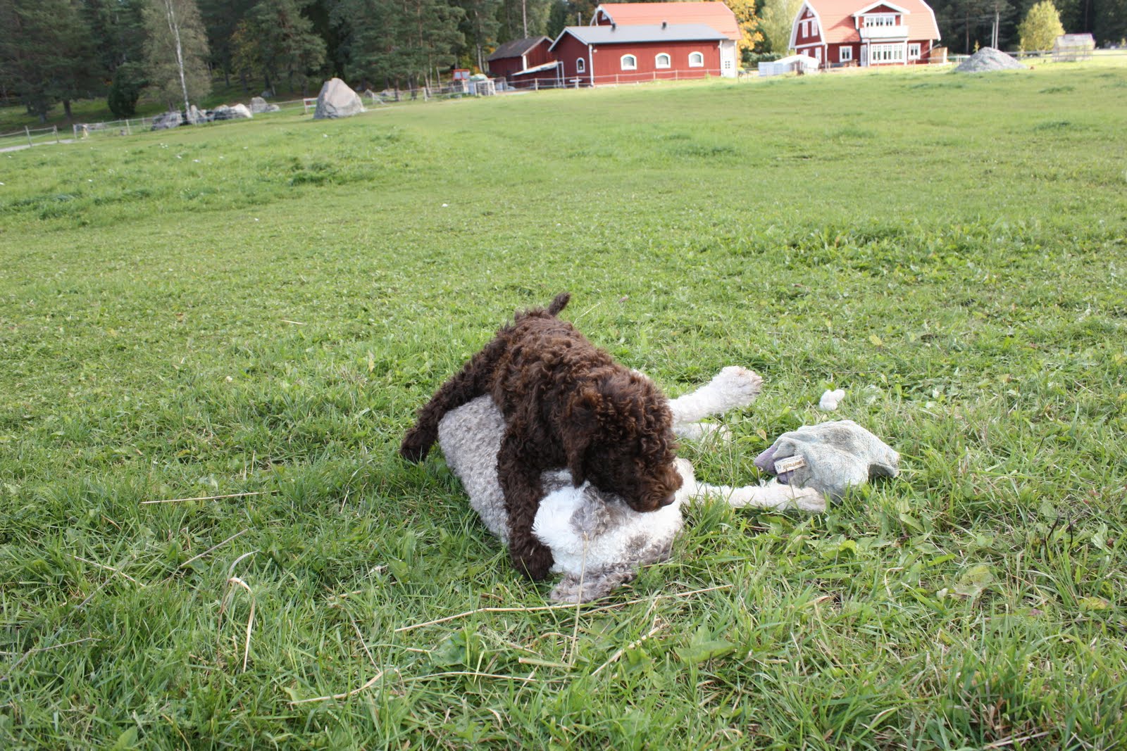 Nu är Bombi kortklippt igen! Så nu kan ingen domare klaga på att pälsen är för lång… Hmmm enligt mitt måttband var hennes päls ca 10cm innan klippning. Ja se dessa domare.. ;-) Här har Volbeat brottat ner Bombi i gräset. Attans vassa tänder har han, pep Bombi. Men är man stor så måste man ju vara snäll! Volbeat väntar fortfarande på att hans nya matte och husse ska hitta honom!